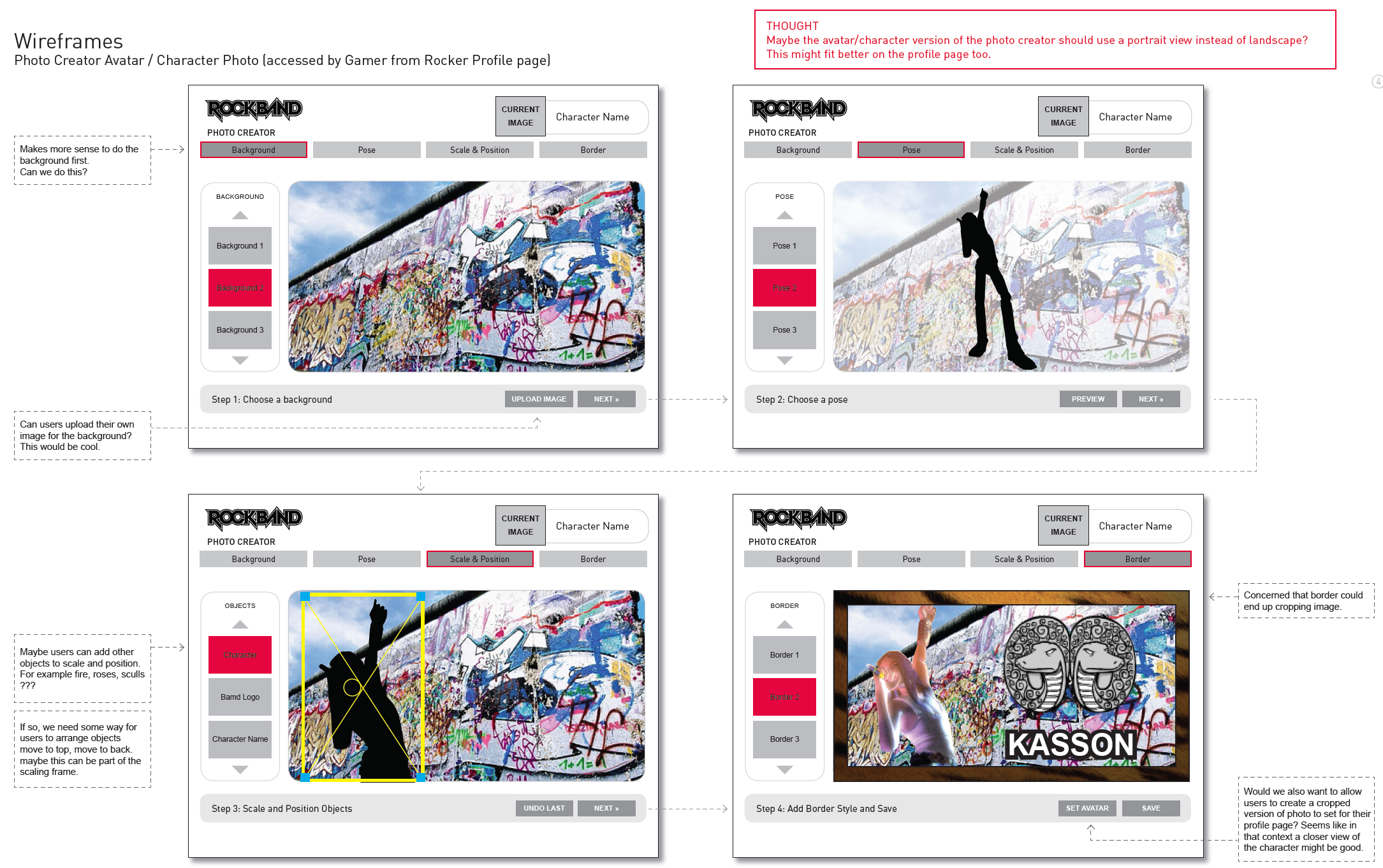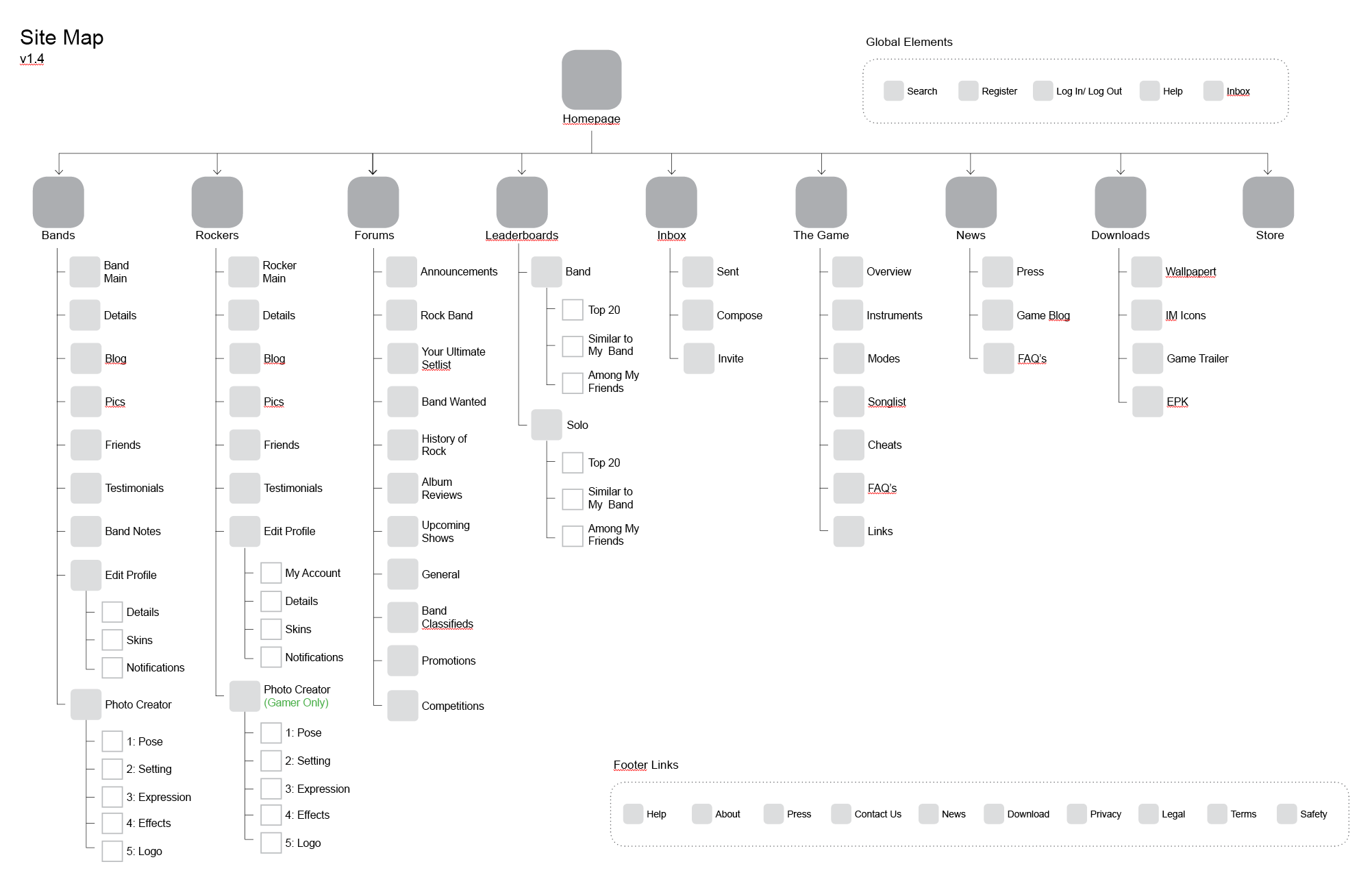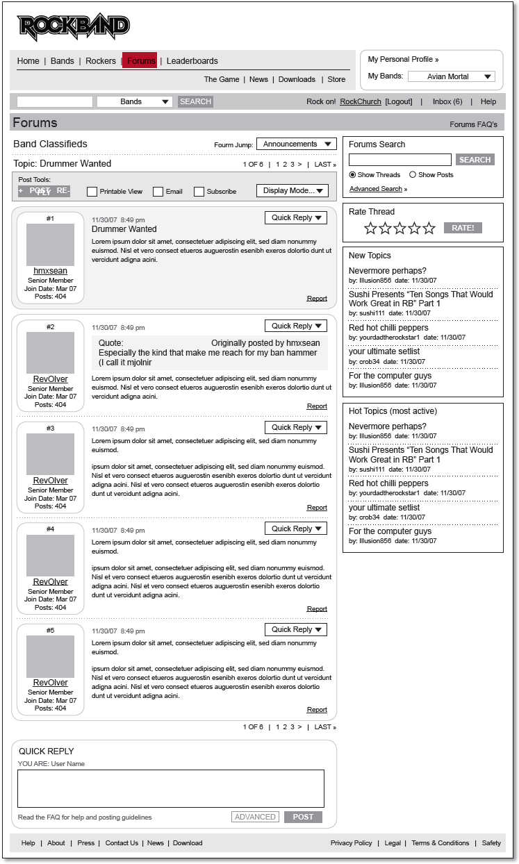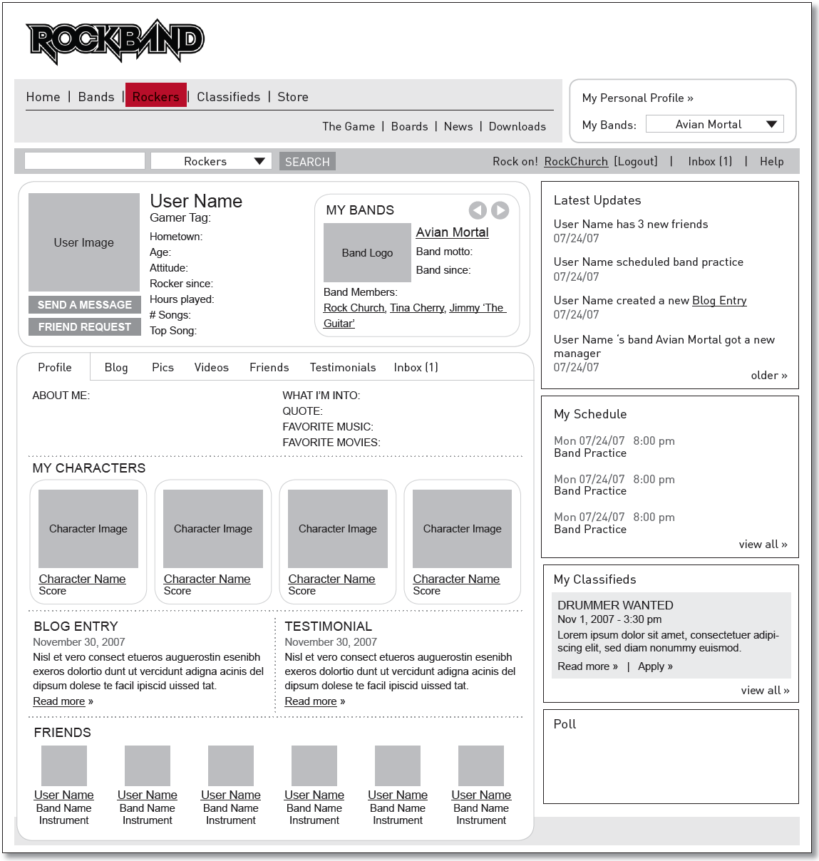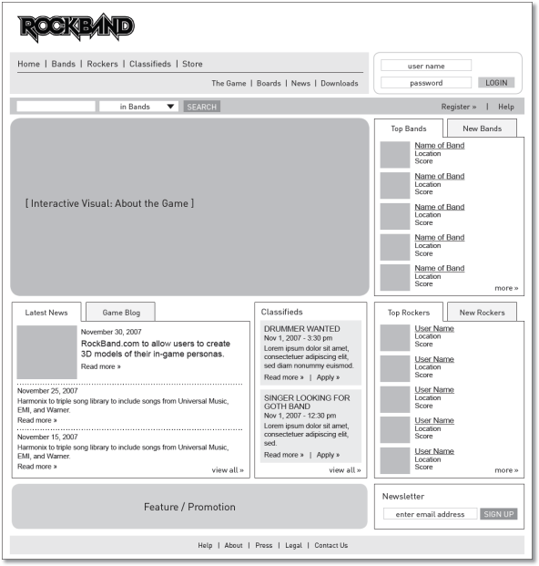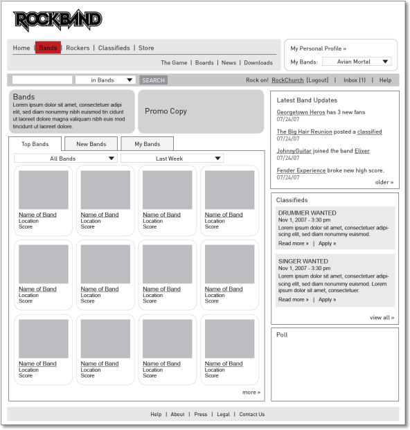 - Wireframes for the full RockBand.com web experience, including detailed specs around key community features such as band profiles, rocker profiles, user profiles and leaderboards