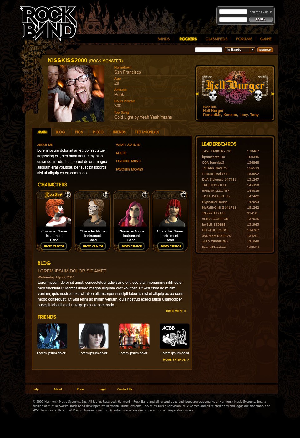 Create an online experience for a new game where the focus was around creating a social network around band in-game stats, rocker profiles and the ability to customize band for in-game play.