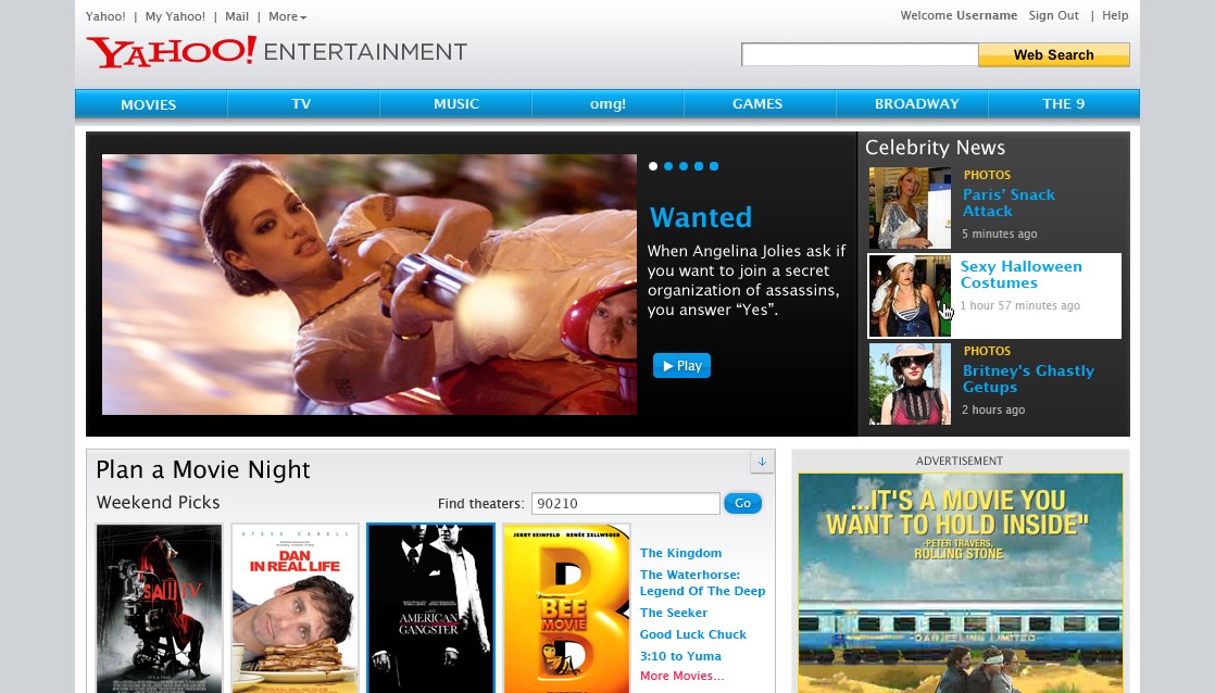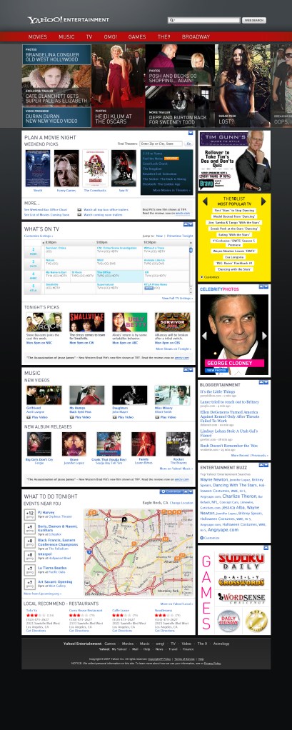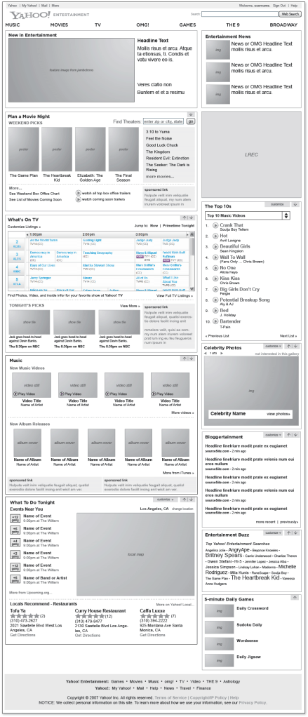 At the time, most of the entertainment properties relied on the Yahoo! home page for the bulk of their traffic. Yahoo! Entertainment wanted to create a useful and engaging entertainment-centric home page to provide easy access to featured entertainment content and create a relevant and fun reason for users to come back. This site needed to be able to stand alone being powered without any editorial control.