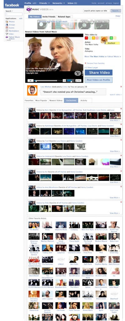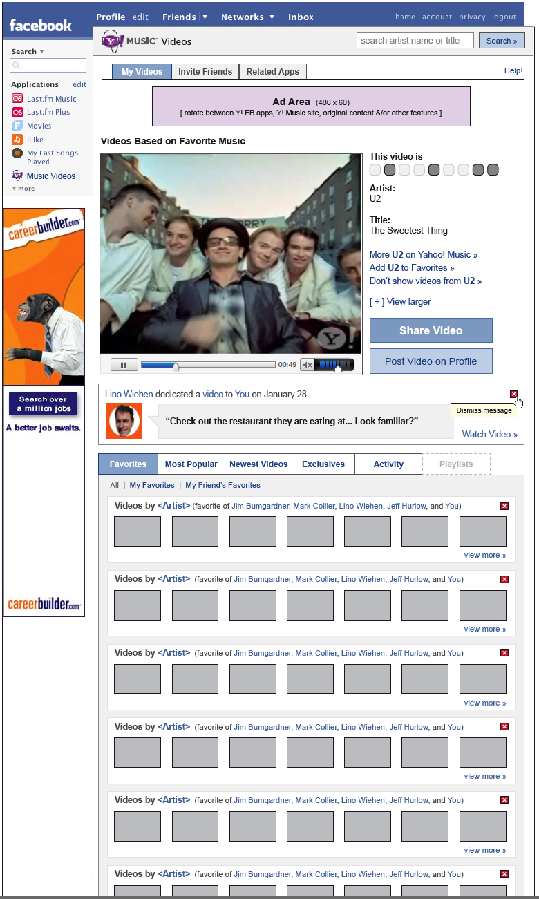 The challenge was to create an engaging social music experience using the Facebook app platform around continuous music video plays based around the user and their social networks music favorites. In order to be an early adopter when the apps platform launched, Yahoo! had less than 30 days to design and develop this experience. To do so, UED (user experience design), engineering and product had to collaborate consistently to create the app at a record pace.