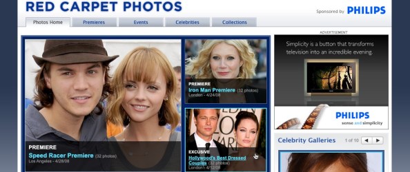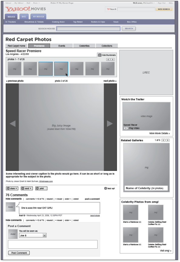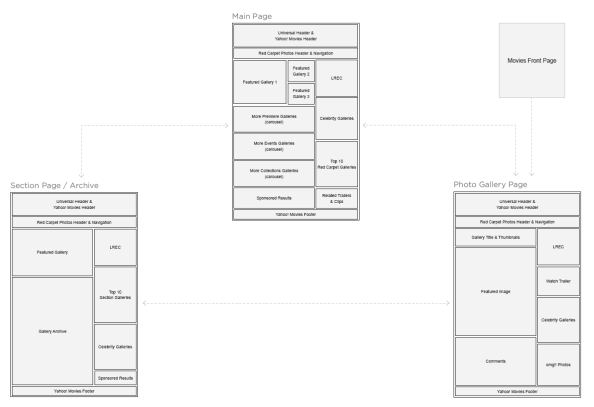 What started as a project to monetize Red Carpet photos, evolved into a full-fledged photo gallery section of all photos for Yahoo! Movies. The main goal was to update the photo experience to better reflect the needs of entertainment users who wanted big glossy photos that are organized into galleries to make them more browsable for users and more marketable to advertisers.